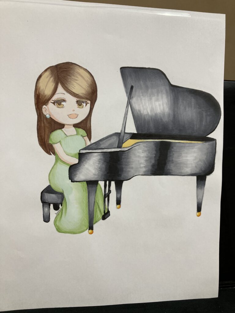 中学生の生徒さんが発表会のウェルカム用に絵を描いてくれました♪ 色鉛筆とサインペンで書いたもの2枚あります。ちょっと若くて可愛く私のことを描いてくれました。 当日は少し大きく印刷して会場入り口に飾りました♪ 彼女は数年前にもウェルカムボードを... -